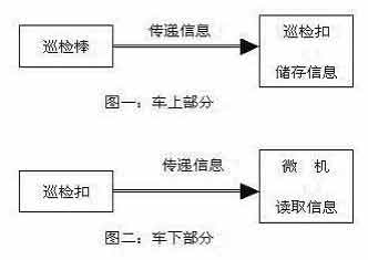 客車(chē)巡檢系統(tǒng)由硬件部分和軟件部分構(gòu)成,硬件部分由巡檢棒和巡檢扣組成,每個(gè)乘務(wù)組一套,巡檢扣分別安裝于行李車(chē)工具室、餐車(chē)配電室、發(fā)電車(chē)?yán)鋮s室(或尾車(chē)配電室),每小時(shí)巡視一次,由巡檢棒向巡檢扣傳輸信息一次,以傳輸信息來(lái)達(dá)到巡視目的。下車(chē)后將巡檢扣交車(chē)間讀取信息。軟件部分由信息讀取器和軟件組成,信息讀取器讀取巡檢扣儲(chǔ)存的信息。(見(jiàn)下圖)