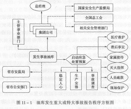事故報告、調(diào)查和處理是安全生產(chǎn)監(jiān)督管理的一項重要內(nèi)容,只有認(rèn)真按照未查明事故原因不放過,未使事故責(zé)任者和群眾受到教育不放過,未吸取事故教訓(xùn)并采取防范措施不放過,未追究事故責(zé)任不放過的“四不放過”原則,依法從嚴(yán)查處事故,才能吸取教訓(xùn),教育群眾,引以為戒,加強管理,從而杜絕類似事故重復(fù)發(fā)生,促進(jìn)實現(xiàn)安全生產(chǎn)。圖11—1是根據(jù)《安全生產(chǎn)法》,結(jié)合油庫加油站