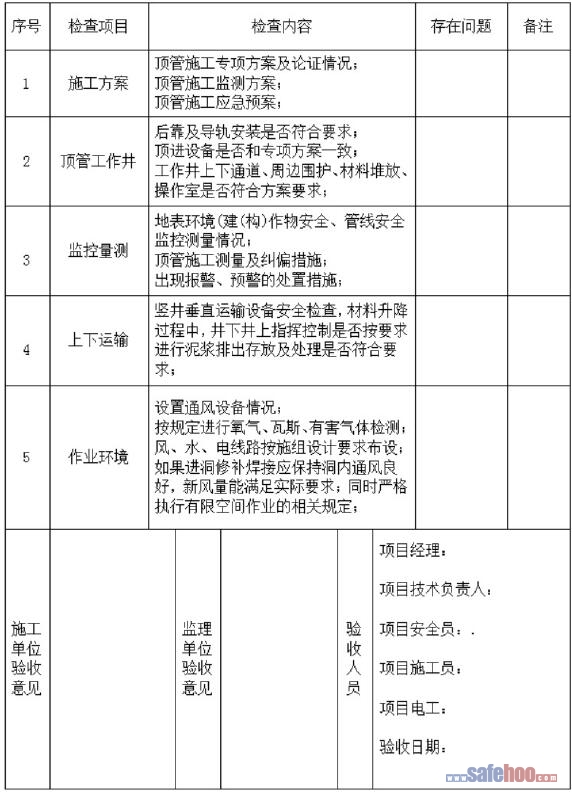 頂管工程施工檢查驗(yàn)收表