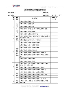 起重機械安全隱患排查表 被排查對象: 聯(lián)系電話: 單位名稱: 排查日期: 年 月 日 序號 排查 項目 排查內(nèi)容 排查結(jié)果(√/×) 1 使用登記情況 1.設(shè)備是否辦理使用登記 2.是否購買合法起重機械 3.安全技術(shù)檔案是否齊全 4.起重機械品種(型式)是否滿足使用條件要求 5.是否按規(guī)定進行定期檢驗 6.檢驗合格標(biāo)志是否按規(guī)定標(biāo)注 2 持證上崗情況 1.起重機司機、司索和信號指揮人員是否按規(guī)定要求進行培訓(xùn)和考核 2.是否建立作業(yè)人員培訓(xùn)、考核檔案 3 安全管理制度建立情況 1.是否建立維護保養(yǎng)和日常檢查制度 2.是否建立安全技術(shù)檔案管理制度 3.是否建立作業(yè)人員安全培訓(xùn)制度 4.是否制定起重機械操作規(guī)程 5.是否建立起重機械定期檢驗和隱患整改制度 6.是否建立起重機械事故防范措施和事故應(yīng)急救援預(yù)案 7.制度是否適合本單位情況 8.制度是否落實到相關(guān)人員 4 安全責(zé)任落實情況 1.單位負(fù)責(zé)人是否了解國家有關(guān)起重機械安全管理法規(guī)、規(guī)章的有關(guān)規(guī)定 2.是否設(shè)置專人負(fù)責(zé)起重機械安全管理工作 3.起重機械維護保養(yǎng)規(guī)程和操作規(guī)程掌握情況 5 安全使用狀況 1.起重機械檢驗合格標(biāo)志、噸位等是否醒目 2.危險性較大的吊裝或施工場所是否有明顯標(biāo)識 3.安全區(qū)域內(nèi)是否有無關(guān)人員活動 4.制動器和各種安全保護裝置是否齊全、有效 4 安全 裝置 1.高度、行程、起重量、速度等保護裝置是否完整、靈敏可靠 2.各種緩沖裝置是否完整、牢固 3.緊急報警裝置是否可靠 4.各種連鎖保護裝置是否可靠,是否保證進入起重機的門或者司機室門開時,總電源不能接通 5 設(shè)備 本體 狀況 1.基礎(chǔ)或者軌道是否存在損壞、變形 2.鋼結(jié)構(gòu)是否存在損壞、變形、腐蝕、開裂現(xiàn)象 3.吊鉤有無損傷 4.鋼絲繩潤滑良好,無變形,其斷絲數(shù)沒有超過規(guī)定 5.各種制動器零部件是否完整、良好,制動裝置運行是否可靠 6.各傳動部分運行是否正常,潤滑是否良好 7.各種電氣設(shè)備及元件是否完整,固定是否牢固,接地是否符合規(guī)定,布線是否合理,無損壞現(xiàn)象;與使用環(huán)境是否相適應(yīng) 8.照明是否符合規(guī)定 9.駕駛室結(jié)構(gòu)是否牢固,無變形、損壞現(xiàn)象,是否有良好的視野,通風(fēng)良好 6 起重機的鋼絲繩 1.是否有安全檢驗合格證,并固定在醒目位置,是否在有效期內(nèi)使用 2.鋼絲繩在一個捻距內(nèi),其鋼絲斷數(shù)沒有超過鋼絲數(shù)的10% 3.鋼絲繩磨損使其直徑相對于公稱直徑減小7%及以上,即使未斷絲也應(yīng)報廢更新 4.卷筒上的終端部位和常繞滑輪的部位,繩面應(yīng)有潤滑油 7 鋼絲繩與卷筒槽匹配 1.鋼絲繩尾端裝卡牢固,壓板數(shù)目不應(yīng)少于2個 2.吊鉤處于最低點時卷筒上至少留有3圈 8 滑輪 1.無裂紋缺損,且轉(zhuǎn)動靈活 9 吊鉤 1.鉤體沒有裂紋、不許補焊 10 制動器 1.制動器靈敏可靠,摩擦片的磨損不得超過原厚度的50% 2.制動時間不大于2s 11 安全防護系統(tǒng) 1.過卷揚限位器完好可靠 2.大小車行程限位器完好可靠 3.門窗電氣聯(lián)鎖保護裝置完好可靠 4.緊急停止開關(guān)完好可靠 5.終端緩沖器完好可靠 6.信號裝置齊全完好可靠 7.軌道端部阻擋器完好可靠 8.露天行車夾軌鉗完好可靠 9.軌道接地完好可靠 10.轉(zhuǎn)動部位保護罩完好可靠 11.滑線保護擋板完好可靠 12.駕駛室地面絕緣墊完好可靠 13.護欄完好可靠 12 吊索具 1.吊索具應(yīng)上架定點擺放,標(biāo)明額定承重量和色標(biāo),性能完好 13 其他 情況 排查單位: 排查人員: