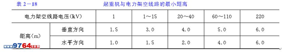 (2) 現(xiàn)場及其附近有電力架空線路時應(yīng)設(shè)專人監(jiān)護,確認(rèn)起重機與電力架空線路的最小距離必須符合表2-18的要求。