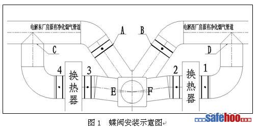 在原有凈化煙氣管道上安裝蝶閥的示意圖如上圖1所示,整個過程需在凈化變頻風機開啟40%左右的情況下完成,首先需完全關閉圖1中的1#、2#、3#和4#蝶閥,先由作業(yè)人員在佩戴防毒面具的情況下,通過管道人孔進入換熱器管道,在圖1中的C、D、E、F處采用氣割的方式將原有凈化管道割開一直徑為2960mm的圓,使得換熱器管道與原有凈化管道相連通,作業(yè)完畢后需封閉全部人孔,然后將圖1中的1#、2#、3#和4#蝶閥完全開啟,這樣可在風機開啟40%左右的情況下,使煙氣經換熱器管道進入凈化除塵器,此時可在圖1中A、B處割開一條φ2960-1000的缺口,最后將蝶閥吊運到A、B口處,完成蝶閥的對接及焊接,這樣可以有效防止管道內的煙氣向外泄露,影響整個安裝過程。