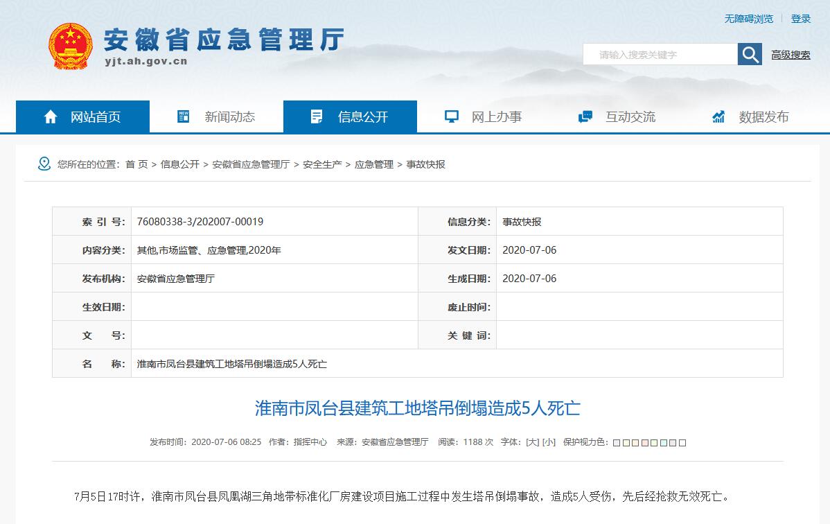 據(jù)安徽省應(yīng)急管理廳7月6日通報,7月5日17時許,淮南市鳳臺縣鳳凰湖三角地帶標準化廠房建設(shè)項目施工過程中發(fā)生塔吊倒塌事故,造成5人受傷,先后經(jīng)搶救無效死亡。