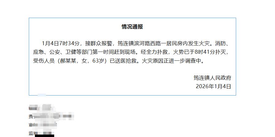 截至發(fā)稿前,“筠連發(fā)布”公眾號發(fā)布情況通報稱,1月4日7時34分,接群眾報警,筠連鎮(zhèn)濱河路西路一居民房內(nèi)發(fā)生火災(zāi)。消防、應(yīng)急、公安、衛(wèi)健等部門第一時間趕到現(xiàn)場。經(jīng)全力撲救,火勢已于8時41分撲滅,受傷人員(郝某某,女,63歲)已送醫(yī)搶救?;馂?zāi)原因正進一步調(diào)查中。