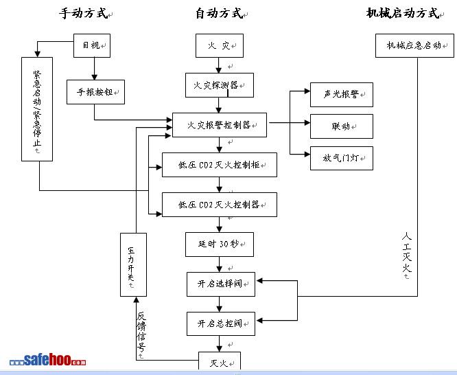 總控閥上裝有機械應(yīng)急手動裝置,當(dāng)自動、手動的電動控制方式均失效時,可向指定方向旋開機械應(yīng)急手動裝置,打開總控閥實施滅火。