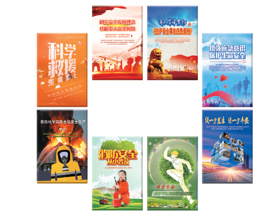 本套招貼體現(xiàn)了國家政策、以人為本、安全發(fā)展、應(yīng)急管理、安全教育等多方面內(nèi)容,緊扣2019 年全國安全生產(chǎn)月主題,畫面簡潔大方,富有沖擊力,既烘托氣氛又發(fā)人深思。適于各級(jí)政府和企業(yè)安全月期間進(jìn)行宣傳展示。