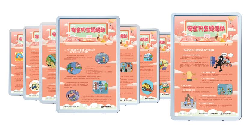 本套掛圖將2019 安全月主題凝結(jié)成精煉的語言,溫馨的畫面,主題突出、層層遞進(jìn),從而加深對(duì)安全發(fā)展的體會(huì)和理解。具有營造安全生產(chǎn)月氣氛、增強(qiáng)員工應(yīng)急意識(shí)、促進(jìn)安全生產(chǎn)的作用。