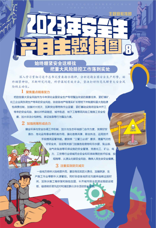 本套展板將2023年安全生產(chǎn)月主題“人人講安全 個(gè)個(gè)會(huì)應(yīng)急”用精煉的語(yǔ)言、新穎的畫(huà)面和明確的主題展示,讓人們樹(shù)立安全發(fā)展的理念,營(yíng)造安全發(fā)展的環(huán)境。具有烘托安全生產(chǎn)月的氣氛,提高員工自我防護(hù)意識(shí),培養(yǎng)員工自我防護(hù)能力,推動(dòng)企業(yè)安全發(fā)展的作用,特別有利于各企事業(yè)單位安全月活動(dòng)的宣傳。