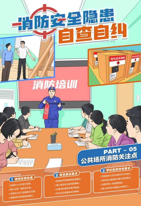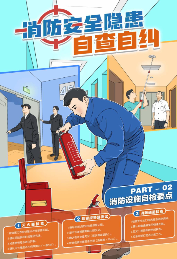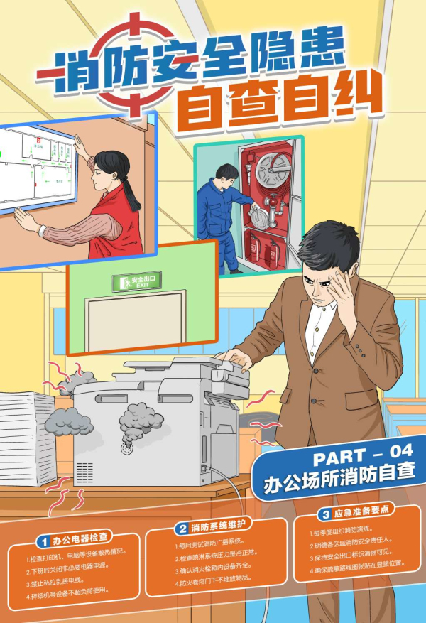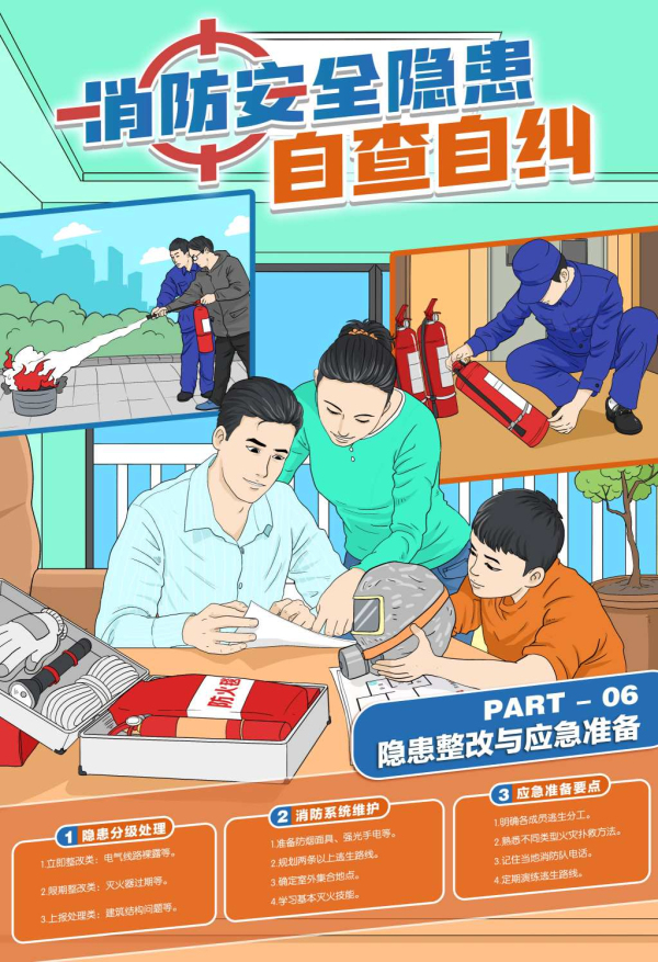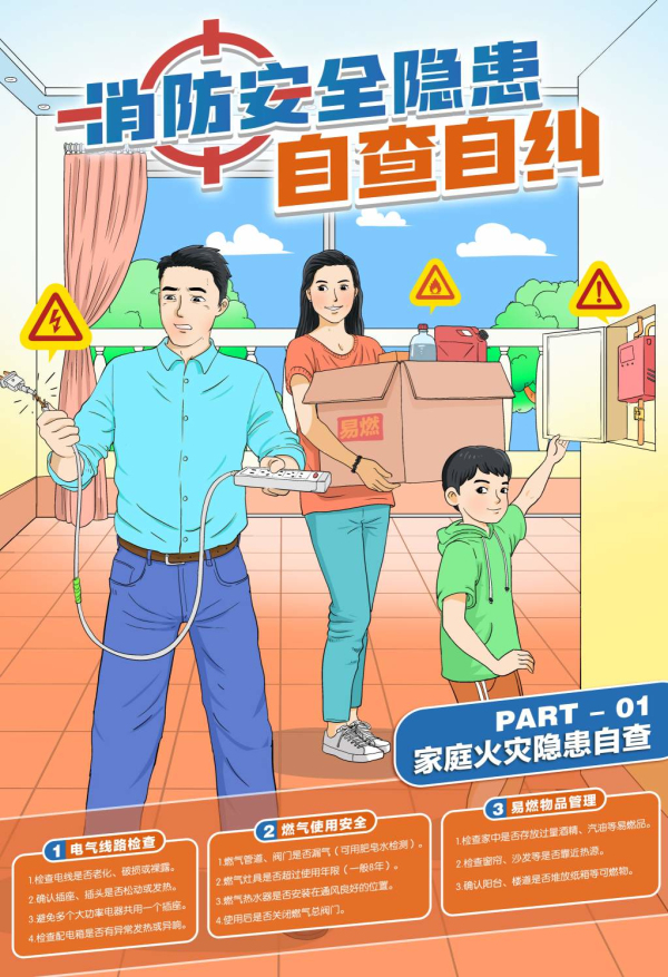 消防安全隱患自查自糾是主動(dòng)防范火災(zāi)、從源頭化解風(fēng)險(xiǎn)的關(guān)鍵手段,通過系統(tǒng)性排查與整改,可最大限度降低火災(zāi)發(fā)生概率、減少災(zāi)害損失。為提升全民消防安全意識、增強(qiáng)隱患排查能力而精心設(shè)計(jì)的宣傳掛圖,以直觀圖像和簡潔文字,助力各單位、場所和個(gè)人開展消防安全隱患自我排查與整改,切實(shí)筑牢消防安全屏障。