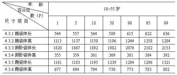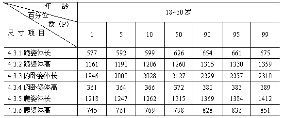 ?。▍⒖技?BR> A1 在工作空間的工效學(xué)設(shè)計中,跪姿、俯臥姿、爬姿的基本人體尺寸項目數(shù)值可參照表A1、表A2計算。