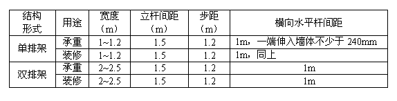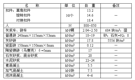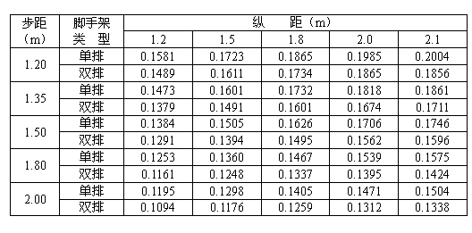 注:1.雙排腳手架每米立桿承受的結(jié)構(gòu)自重標(biāo)準(zhǔn)值是指內(nèi)、外立桿的平均值;單排腳手架每米立桿承受的結(jié)構(gòu)自重標(biāo)準(zhǔn)值系按雙排腳手架外立桿等值采用;