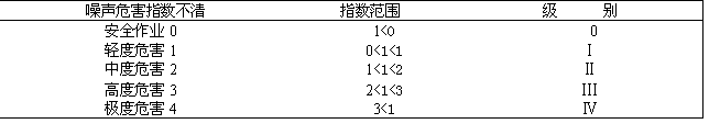 為了便于實(shí)際操作,簡(jiǎn)化了噪聲危害指數(shù)的計(jì)算過程,制定了噪聲作業(yè)分級(jí)級(jí)別表,按下表進(jìn)行分級(jí)