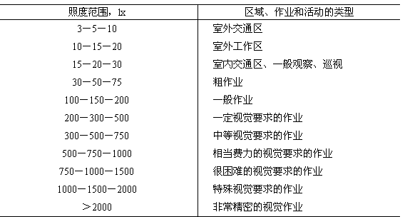 各種不同區(qū)域作業(yè)和活動的照度范圍值應(yīng)符合表1的規(guī)定。一般采用表1的每一照度范圍的中間值。當(dāng)采用高強氣體放電燈作為一般照明時,在經(jīng)常有人工作的場所,其照度值不宜低于50lx。