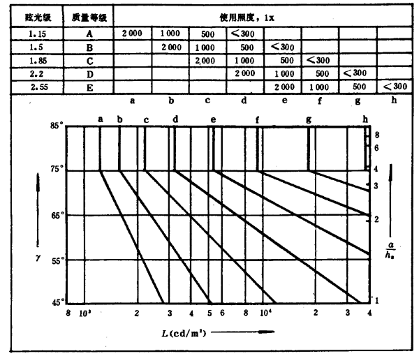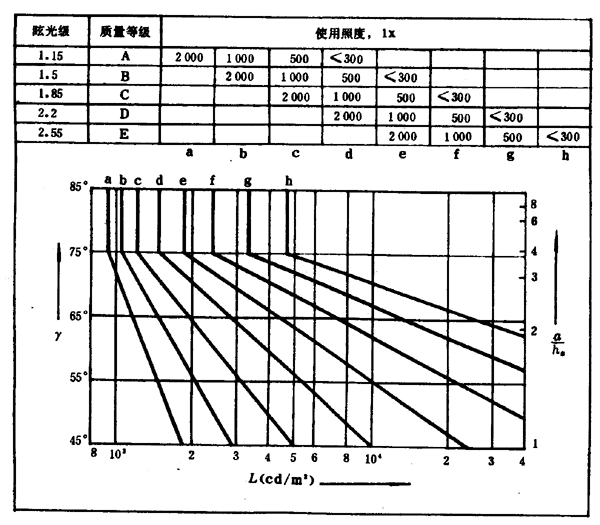 A1.3.2 根據(jù)設(shè)計場所的照明質(zhì)量等級和使用照度值選擇相應(yīng)的限制曲線。對于不同的作業(yè)和活動場所,根據(jù)眩光限制的質(zhì)量要求分為: