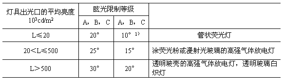 燈具亮度除應(yīng)滿足亮度曲線法的限制要求外,還應(yīng)按表A1限制燈具的最小遮光角。