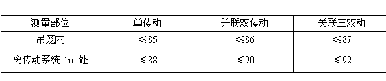 4.2.1.24 升降機正常作業(yè)狀態(tài)下的噪聲不允許超過表2的規(guī)定。SC型升降機,當傳動系統(tǒng)在籠內(nèi)時,測吊籠內(nèi)傳動系統(tǒng)處;當傳動系統(tǒng)在吊籠頂時,則分別測吊籠內(nèi)與頂部傳動系統(tǒng)處的噪聲。SS型升降機,只測吊籠外卷揚機處的噪聲。