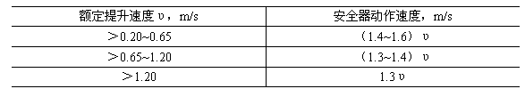 安全器動作速度的取值范圍 表1