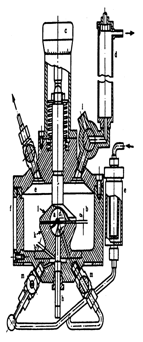 a-標準外殼內腔;b-試驗箱內腔;c-千分表;d-泵;e-阻火器;f-觀察窗;m、i-閥門;h-點火電極;k-標準外殼下殼體;l-標準外殼上殼體