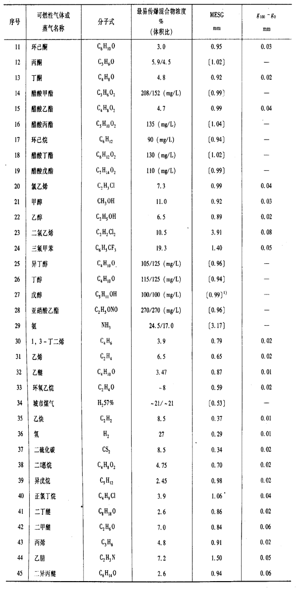 注:1)表列方括號內的數據,例如:〔0.96〕不是用標準規(guī)定的試驗裝置,而是用英國規(guī)定的8L球形試驗裝置測得的。8L球形標準外殼內部充以最易傳爆混合物濃度,外部充以最易點燃混合物濃度。