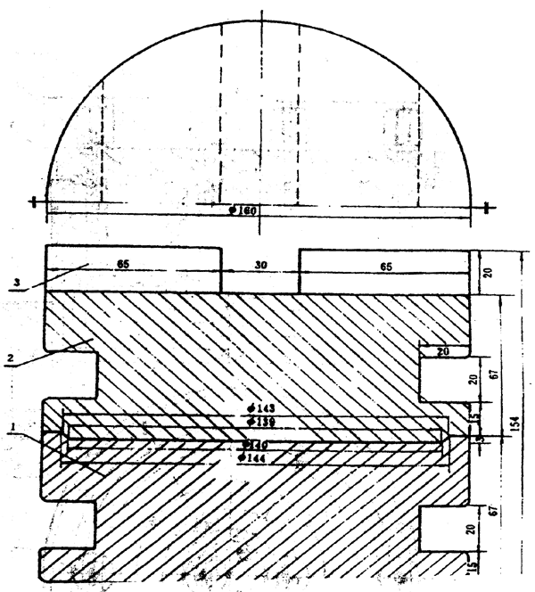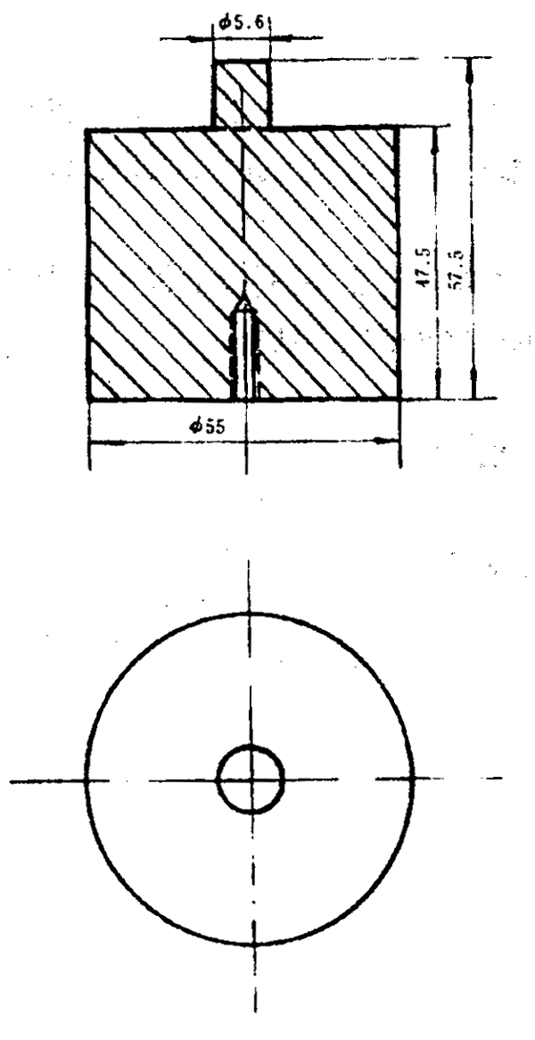 c. 一個(gè)圓柱形四端環(huán)形電極,其四個(gè)圓環(huán)用厚度為15mm的有機(jī)玻璃圓盤(pán)裝配在一起,底面加工成同一水平面,并鍍以5μm厚的黃金。電極總柱高為53mm,有效測(cè)試面是一個(gè)內(nèi)圓直徑為44mm、外圓直徑為114mm、寬為35mm的環(huán)形面。電極材料黃銅,自重2.8kg,附加重量20kg(電級(jí)尺寸詳見(jiàn)圖2a,電極附加重塊尺寸見(jiàn)圖2b)。