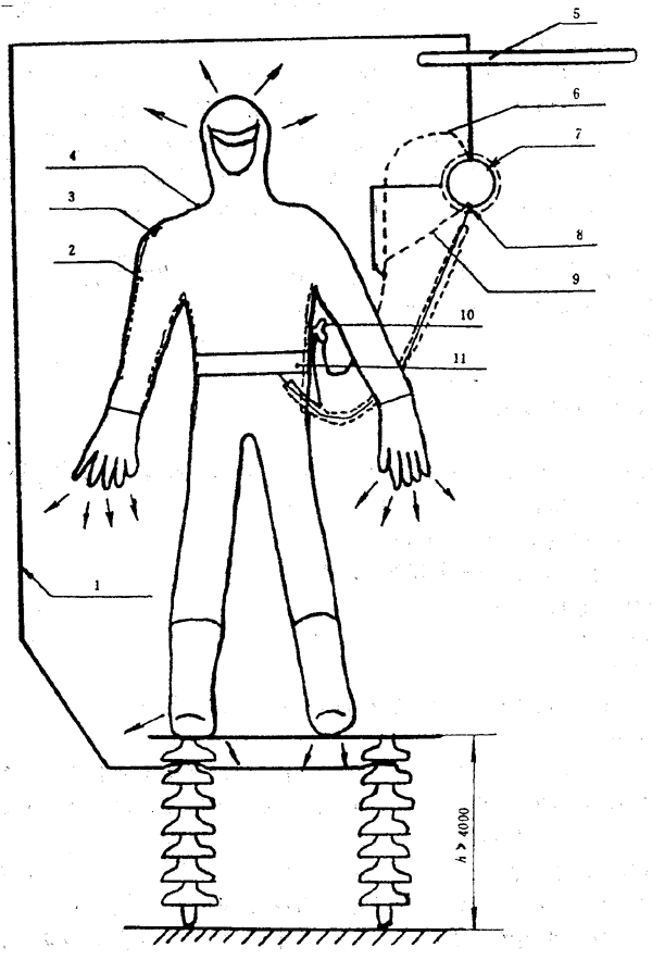 1―旁路等電位線;2―人體皮膚;3―絕緣連褲內(nèi)衣;4―屏蔽服;5―高電位線;6―測(cè)量電流I