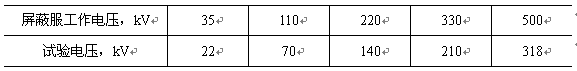 b. 在場(chǎng)強(qiáng)表探頭分別置于屏屏服帽子下頭頂處及屏蔽服的內(nèi)胸前、背后等3處位置的情況下,按規(guī)定使用電壓等級(jí),在模擬導(dǎo)線上施加最高運(yùn)行相電壓(試驗(yàn)電壓標(biāo)準(zhǔn)見(jiàn)下表),然后用望遠(yuǎn)鏡分別讀取3個(gè)數(shù)據(jù);