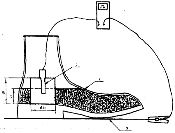 對(duì)裝有分流連接線的鞋子,將鞋子平放在平板電極上,其內(nèi)裝入直徑為4mm的鋼珠達(dá)20mm深,可以發(fā)流連接線與平板電極之間測(cè)量電阻。