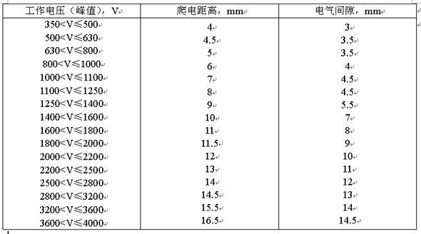 輸出電路中帶電部件與下述部位之間的爬電距離、電氣間隙不應(yīng)小于表101所列的數(shù)值: