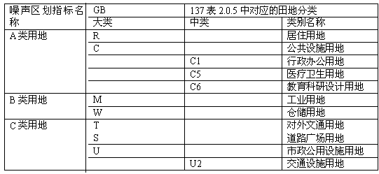 噪聲區(qū)別用地指標(biāo)是反映區(qū)域主導(dǎo)功能,由城市用地分類(lèi)(見(jiàn)GBJ 137)歸納成的三類(lèi)用地。其中: