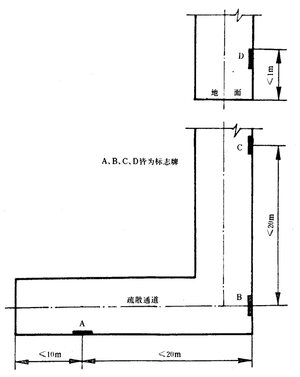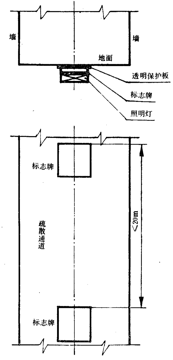 6.10.1.1疏散通道中,“緊急出口”標(biāo)志宜設(shè)置在通道兩側(cè)部及拐彎處的墻面上,標(biāo)志牌的上邊緣距地面不應(yīng)大于1m,如圖2所示。也可以把標(biāo)志直接設(shè)置在地面上,上面加蓋不燃透明牢固的保護(hù)板,如圖3所示。標(biāo)志的間距不應(yīng)大于20m,袋形走道的盡頭離標(biāo)志的距離不應(yīng)大于10m。