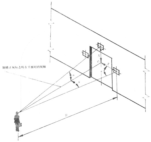 6.7標(biāo)志的偏移距離X應(yīng)盡量縮小。對于最大觀察距離D的觀察者,偏移角θ一般不宜大于5°,最大不應(yīng)大于15°。如果受條件限制,無法滿足該要求,應(yīng)適當(dāng)加大標(biāo)志的尺寸以滿足醒目度的要求。
