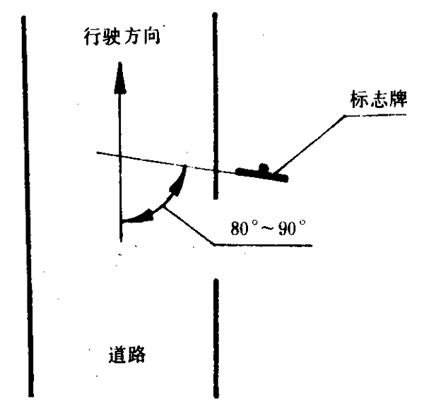 6.11.2.2設(shè)置在道路邊緣的標(biāo)志牌,在裝設(shè)時(shí),標(biāo)志脾所在平面應(yīng)與行駛方向垂直或成80°~90°角,如圖7所示。