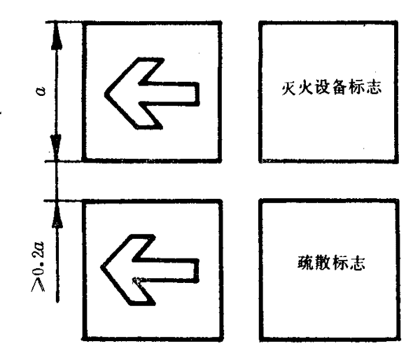 7.2.3當(dāng)疏散標(biāo)志與滅火設(shè)備標(biāo)志并列設(shè)置并且二者方向相同時(shí),應(yīng)將滅火設(shè)備標(biāo)志放在上面,疏散標(biāo)志放在下面。兩個(gè)標(biāo)志之間的間隙不應(yīng)小于標(biāo)志公稱尺寸的0.2倍。如圖10所示。