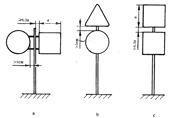 7.2.4.3正方形和其它形狀的標(biāo)志牌共同設(shè)置時(shí),正方形標(biāo)志牌與標(biāo)志桿之間的間隙不應(yīng)小于標(biāo)志公稱尺寸的0.2倍,其它形狀的標(biāo)志牌與標(biāo)志桿之間的間隙應(yīng)不小于5cm,如圖11a所示。