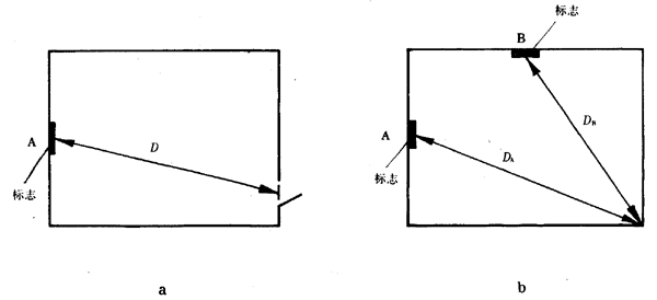 A2 如果要求標(biāo)志對房間內(nèi)任何位置站立的觀察者皆保持良好的醒目度,那么應(yīng)找出最大的觀察距離D,即為房間內(nèi)離標(biāo)志最遠(yuǎn)位置的觀察者的眼睛至標(biāo)志的距離。如圖A1b所示,如果標(biāo)志設(shè)在A處,那么最大觀察距離為DA;如果標(biāo)志設(shè)在B處,那么最大觀察距離為DB。