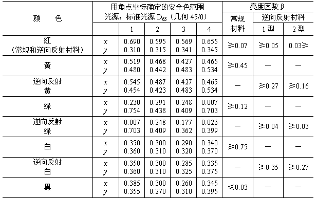 b.標(biāo)志的色度坐標(biāo)及亮度因數(shù)超出其適用范圍(參見附錄C中表C1);