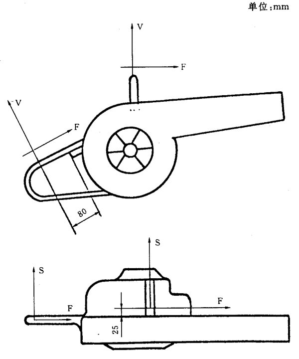 在風(fēng)力滅火機(jī)的前、后把手的手握處,測(cè)量F、S、V三軸向振動(dòng)的計(jì)權(quán)加速度。