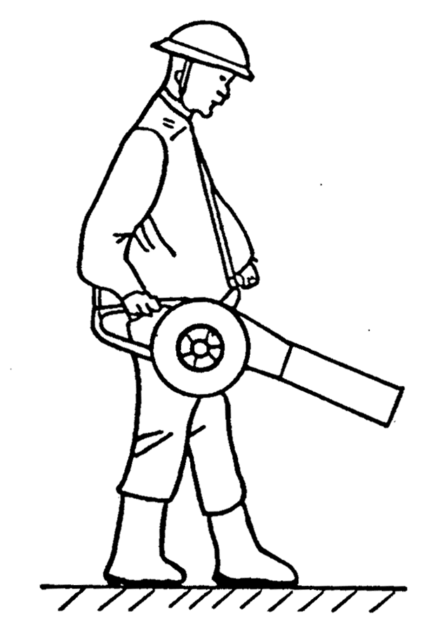 4.4.1 用背帶將風(fēng)力滅火機(jī)側(cè)掛在操作者身上,并用雙手握住前、后把手,如圖2。