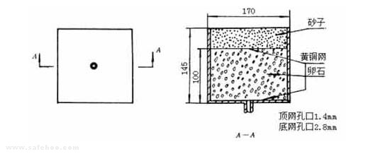 170×170×145mm,殼體由金屬網(wǎng)分為上下兩層,分別填裝鵝卵石和砂子,下層鵝卵石的填裝高度為100mm ,上層的砂子與點(diǎn)火器上緣齊平,砂的粒徑約為4~8mm。