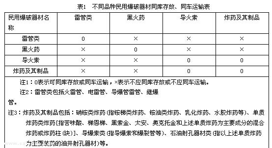 8.2.7 各類民用爆破器材宜單獨(dú)品種專庫存放,倉庫內(nèi)嚴(yán)禁儲存無關(guān)物品。當(dāng)受條件限制,需在同一倉庫內(nèi)存放兩種以上民用爆破器材時(shí),應(yīng)按表1規(guī)定執(zhí)行。各種民用爆破器材包裝應(yīng)是完整無損的成品方能同庫存放。