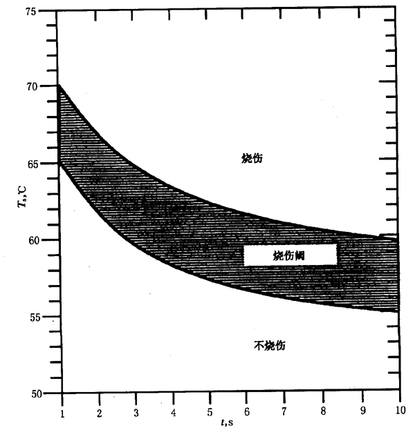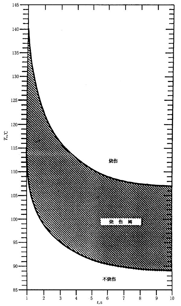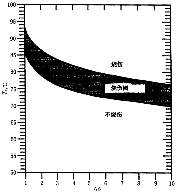 燒傷閾曲線上的點(diǎn)表明,當(dāng)皮膚同熱表面接觸時(shí),對(duì)應(yīng)某一具體的接觸時(shí)間,有一個(gè)介于不使皮膚傷害和發(fā)生表皮燒傷之間的表面溫度。通常,曲線以下的表面溫度值不導(dǎo)致燒傷,曲線以上的表面溫度值將導(dǎo)致皮膚的燒傷。