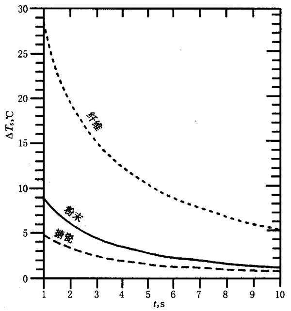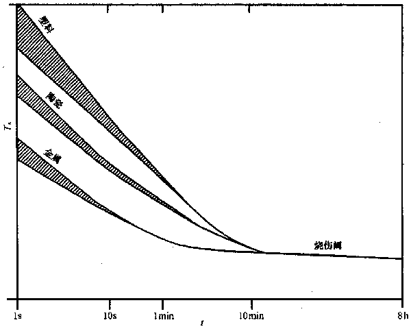 在短時(shí)間(1s~10s)接觸條件下,不是以數(shù)據(jù)規(guī)定燒傷閾分布,而是以曲線反映燒傷閾分布與接觸時(shí)間的關(guān)系。熱傳導(dǎo)率特性相同的材料燒傷閾合并顯示在一個(gè)范圍。