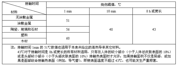注2:當(dāng)皮膚同熱表面接觸時(shí),如果未超過本標(biāo)準(zhǔn)規(guī)定的燒傷閥值,通常是沒有燒傷風(fēng)險(xiǎn),但是,可能出現(xiàn)疼痛,如果還需要防止疼痛,表面溫度值應(yīng)該以自合適的其他來源。