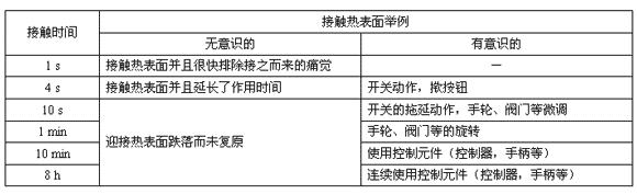 接觸時(shí)間大于1min、介于表1規(guī)定間隔之內(nèi)者,適于在較短和較長(zhǎng)的接觸時(shí)間對(duì)應(yīng)的燒傷閾值之間作插值計(jì)算。