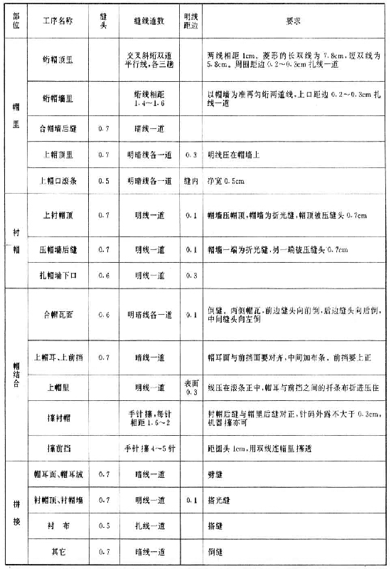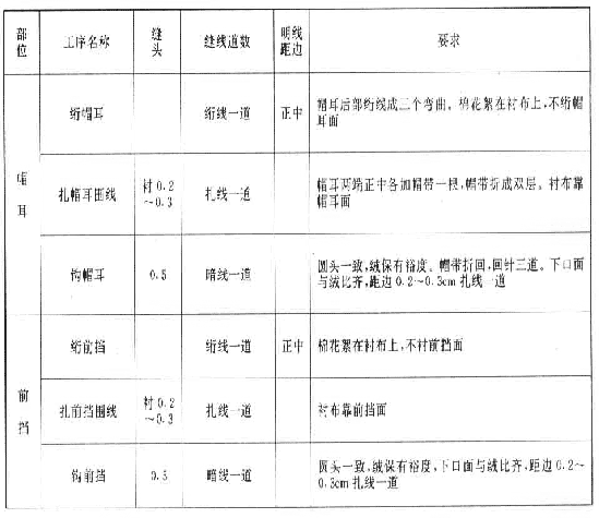 ——紗向、拼接:帽瓦面、帽頂里、襯帽頂均按經向下裁。帽耳面、帽墻里均按緯向下裁。帽前擋面、帽里滾條、前擋栽絨、帽耳栽絨、襯布經、緯向下裁均可。帽瓦面不許拼接,襯布限拼三道,其余限拼一道。