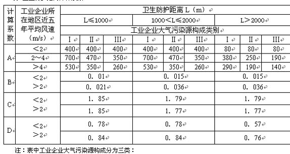 A,B,C,D——衛(wèi)生防護(hù)距離計算系數(shù)(無因次),根據(jù)石化企業(yè)所在地區(qū)近五年平均風(fēng)速及工業(yè)企業(yè)大氣污染源構(gòu)成類別從表1中選取,并且根據(jù)石化企業(yè)生產(chǎn)裝置特點(diǎn)和衛(wèi)生防護(hù)距離制定原則,大氣污染源類別按Ⅱ類考慮。