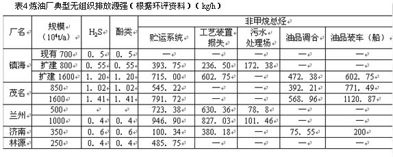 另外,此次只考慮工廠規(guī)模而不考慮煉制原油的含硫量,從而減少了制約因素。由于在環(huán)評中無組織排放源基本上帶有一定的宏觀性且具體實(shí)測數(shù)據(jù)較小,多半是根據(jù)計算和物料衡算推導(dǎo)的,因此各廠數(shù)據(jù)相差較大。但同1982年資料中源強(qiáng)數(shù)據(jù)相比,總體有較大幅度的下降,見表4。