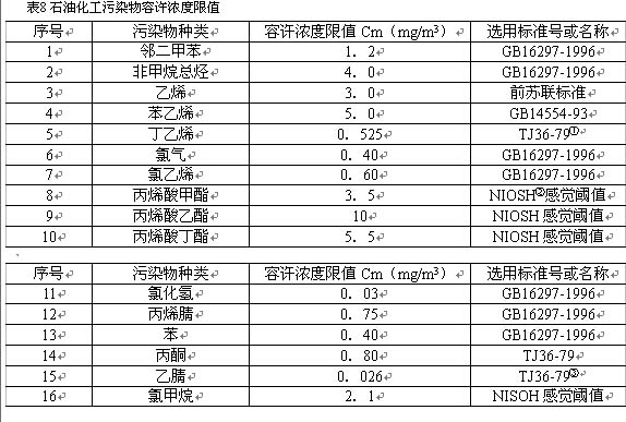 石油化工企業(yè)一般排放多種大氣污染物,且無組織排放與有組織排放共存。為確定衛(wèi)生防護(hù)距離標(biāo)準(zhǔn),選定其中排毒系數(shù)最大,且對下風(fēng)向大氣環(huán)境影響最大的無組織排放污染物作為主要污染物。表8列出了所選定的污染物及其最大容許濃度。其中有一部分尚未列入我國國家標(biāo)準(zhǔn)的污染物,其容許濃度參照國外標(biāo)準(zhǔn)。