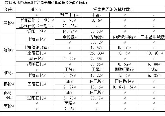 表14列出典型工廠無組織排放量統(tǒng)計值,這些值是通過實(shí)地污染源調(diào)查、環(huán)評資料以及環(huán)境監(jiān)測所得地面濃度反推獲得。由于單體——聚合物——紡絲的三部分裝置生產(chǎn)規(guī)模及匹配狀況差異、工藝技術(shù)設(shè)備、原料純度的差異和裝置投用期、設(shè)備完好率、生產(chǎn)管理水平的差異等,使各廠排放水平有較大不同。