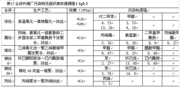 基于典型工廠染物無組織排放量調(diào)查,考慮到現(xiàn)狀和發(fā)展趨勢,確定合纖行業(yè)污染物無組織排放可控水平,見表15。
